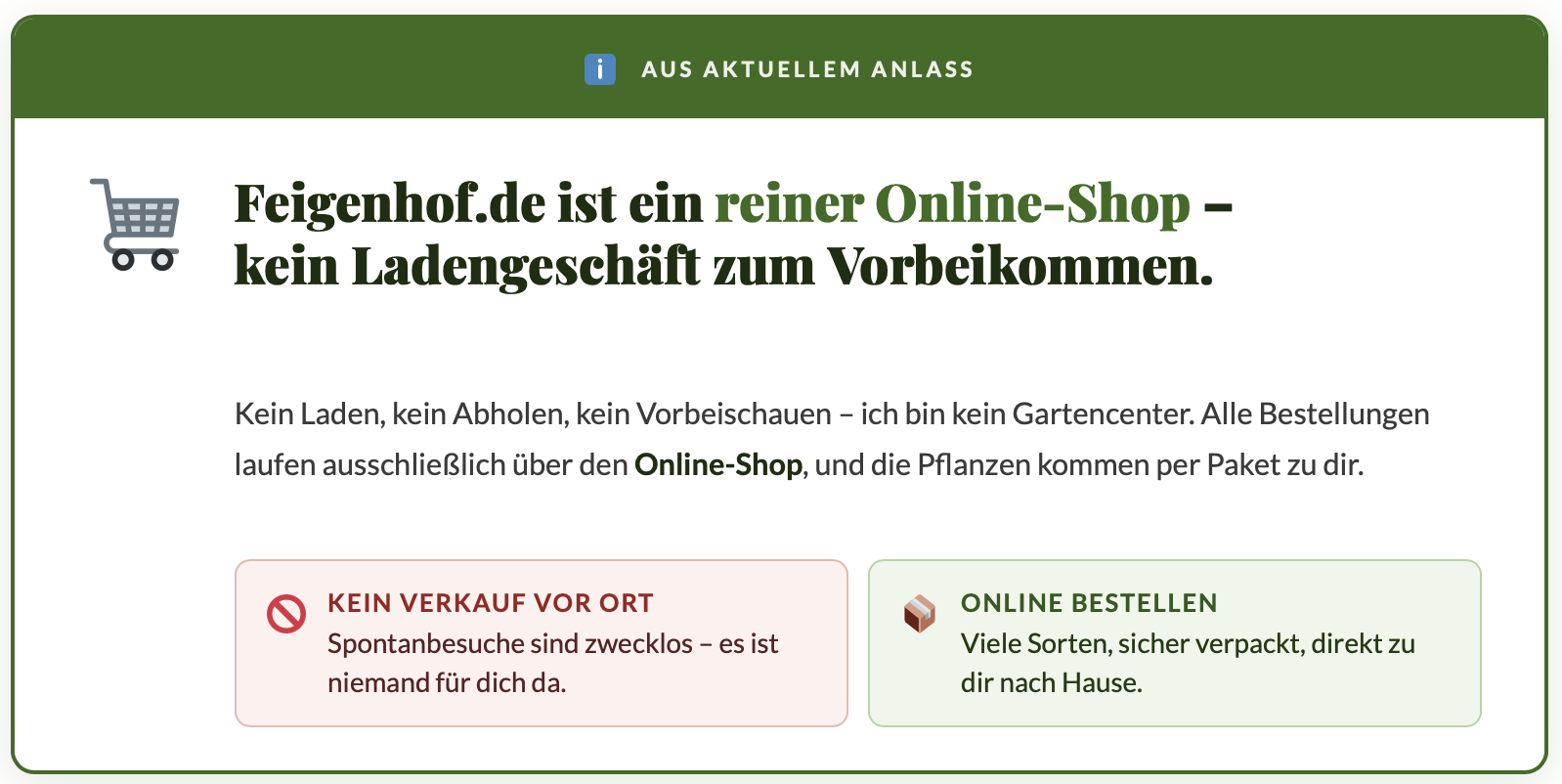 Der Hinweis auf der Startseite soll deshalb keine Rechtfertigung sein, sondern eine klare Orientierung geben. Wer Feigenhof besucht, soll sofort verstehen: Hier wird online bestellt, nicht vor Ort eingekauft, und für die Kontaktaufnahme ist das Kontaktformular der vorgesehene Weg. Das schützt nicht nur meine privaten Abläufe, sondern hilft auch Euch, weil von Anfang an klar ist, wie der Shop funktioniert.